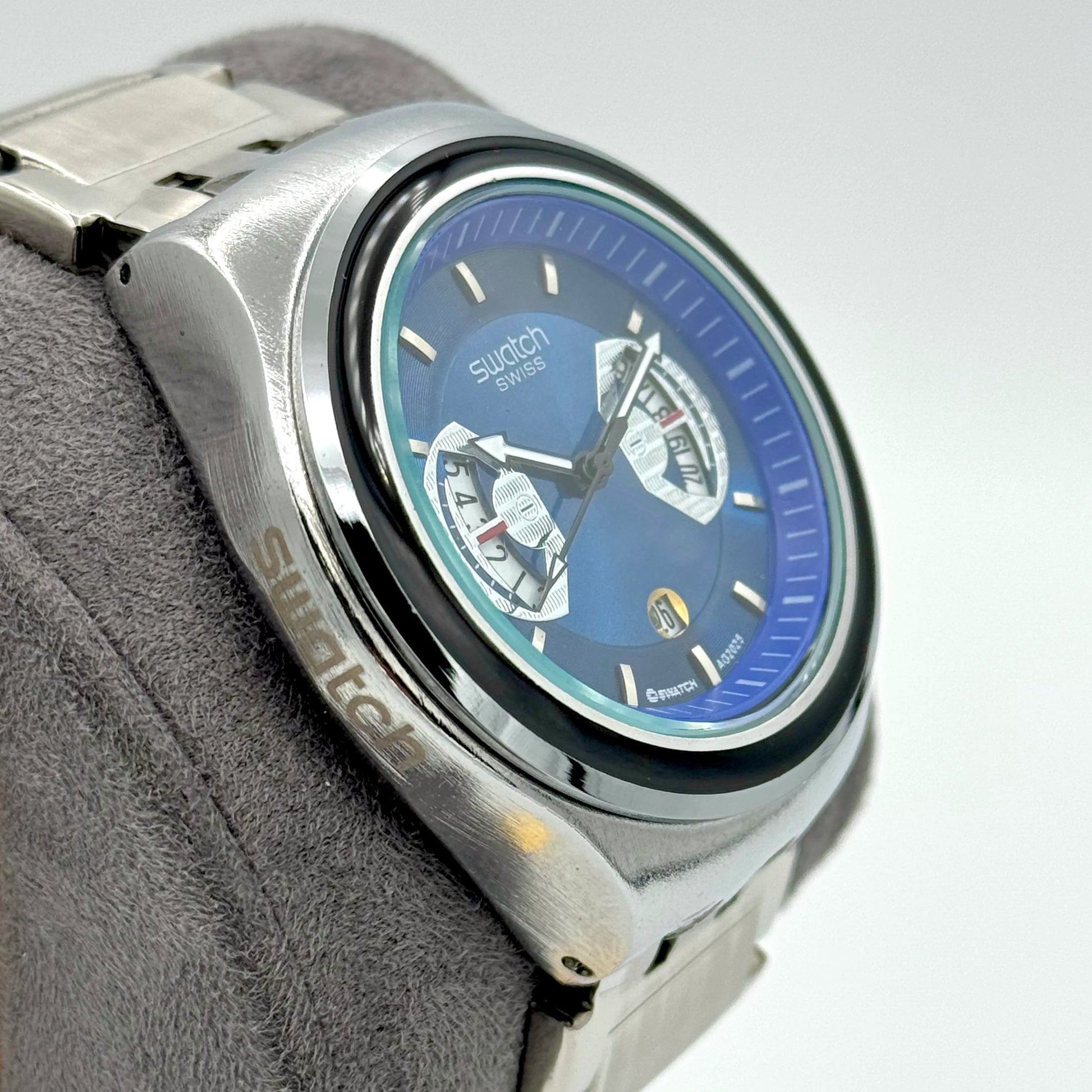 Rehaussez votre style avec la Swatch Irony Chrono YVS488G, alliant cadran argenté, accents noirs et bracelet en acier inoxydable.